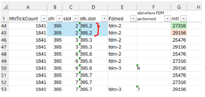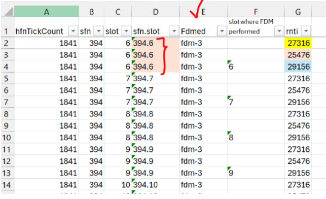 Either all these 3 rnti's can be Multiplexed in the same sfn.slot So, in below snip all 3 rnti's are FDMed in same sfn.slot - 394.6 and should be continuous, so Column "E" should have fdm-3