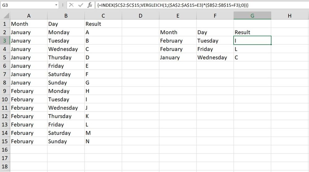 =INDEX($C$2:$C$15,MATCH(1,($A$2:$A$15=E3)*($B$2:$B$15=F3),0))