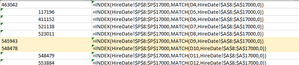 I am using this formula to pull a date from one sheet to another, by matching the employee ID(s). =INDEX(HireDate!$P$8:$P$17000,MATCH(D9,HireDate!$A$8:$A$17000,0)) 99% of my formulas result in t...