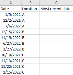 How do I use a formula to populate column C with the most recent date based on the location? Have the data on the left, need results on the right. Thank you!