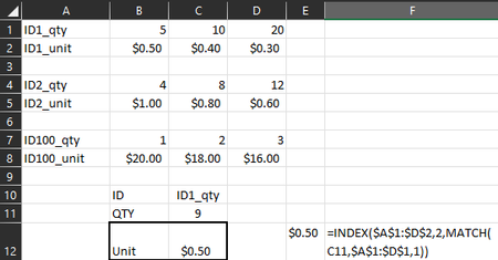 =INDEX($K$2:$K$27,MATCH($H$3,$J$2:$J$27,0))The named ranges are ID_1 for B2:D2 and QTY_ID1 for B1:D1 and so on in the example. You can add hundreds of named ranges in the worksheet. The INDEX / MATCH returns the QTY_ID from a reference table.