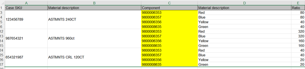 I want to be able to input these three components 9800006353, 9800006357, 9800006356 and return rows 3-6, 12-15, 24-27. Because the Case SKU in column A has more than just those three components.