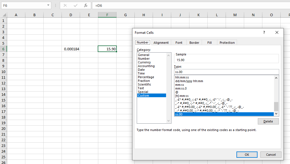But when I input my time in my cell as seconds.hundreths, it returns nothing.