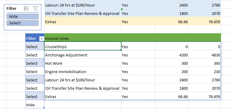 The invoice lines are built up using a single FILTER formula that looks in the working block and filters to only pull lines where they are marked as "Yes"