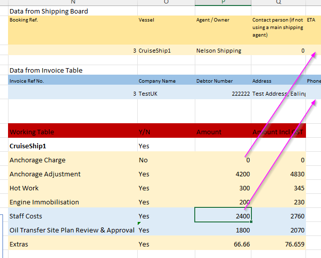 The blue section of the "Working table" is getting data from the Invoice sheet and the Yellow bits are getting data from the Shipping BoardI did have values for labour, I called it "Staff Costs" but you can change the wording. You could have a formula that concatenates text and values