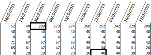 I have attached a copy for you. The data is in Rows and the dates show the stock count at those dates for the item in the row. As stock replenishment orders are received, they are added into the total for the stock item.
