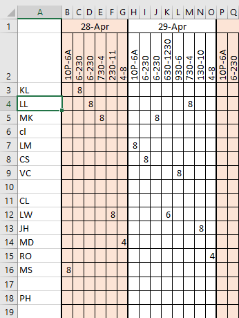 chescott80 , what is the formal logic behind, why in B5 and not in C5 or B6? Same for others. And layout for Monday is fully different from one for Sunday., what is the logic for this?