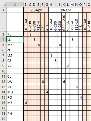 In column C, the 8 (for 8 hr shift) could be anywhere down the column, not necessarily in the KL row...where ever the 8 is the corresponding initials need to go into B5 on the calendar spreadsheet. In column D, the corresponding initials would be entered into C5 on the calendar.