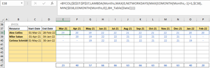 =MAKEARRAY(ROWS(C38:C40),COLUMNS(E37:P37),LAMBDA(r,c,MAX(0,NETWORKDAYS(MAX(EOMONTH(INDEX(E37:P37,c),-1)+1,INDEX(C38:C40,r)),MIN(INDEX(D38:D40,r),EOMONTH(INDEX(E37:P37,c),0))))))