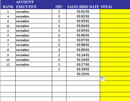 Harun24HR I only listed them as the same name for the purposes of keeping our recruiter's names confidential. 🙂 I didn't want to blast my team's names all over the internet. On our actual spreadsheet there is each of their names, their sales hire date, their cost center number and then the number of clients they have based on the information entered into sheet two.