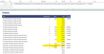 =IFERROR(SUMIFS('Cleaned Data'!F:F,'Cleaned Data'!D:D,"75 Minute All-Inclusive Massage",'Cleaned Data'!E:E,"Cedtara",'Cleaned Data'!H:H,"<>"),"$0.00")