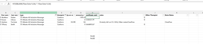 So in this workbook I'm using formulas to calculate tips for certain appointment types. In column H in the raw data tab I'm using an ISBLANK formula to copy cell information from the previous tab, and leave it blank if there is nothing there. Because the formulas in the pay rate sheets (currently looking at Cedtara but this problem will be on everyone's sheet if I don't fix it) depend on checking whether a cell is blank or not. You can see in the first screenshot, an ISBLANK formula returns as FALSE for both of the blank cells (Cells H305/306 are referencing H34 and H112 to test it, the formula in the bar is the formula in the H34/H112 cells and H column as a whole).