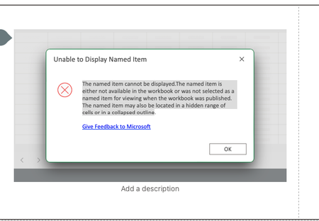 Hi, I wanted to insert a chart from my spreadsheet into Sharepoint, however I received message below. Can somebody please advise as to how to designate the chart as a 'Named item'? I am usi...