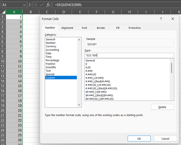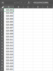 This will create sequence from 1 to 999Custom Format Cell as original (000 to make it a 3-digit number). Change to 0000 to make it a 4-digit number. Perhaps change S25.nnn to S25.0nnn