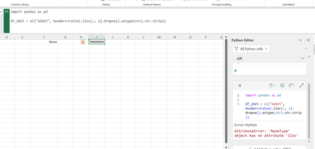 Hello, I am trying to get values from the C column in the worksheet A2025. I am not even sure the xl("A2025") is getting anything. when i just do df_2025 = xl("A2025", headers=False) I get back...