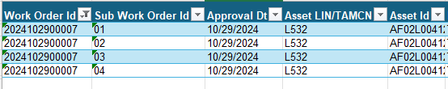 {"Work Order Id", "Sub Work Order Id", "Approval Dt", "Asset LIN/TAMCN", "Asset Id", "Item Desc", "Maint Activity", "Priority Cd", "Sub Work Order State Cd", "Work Order Status Cd", "Maint Team Id", "Service Performed", "Service End Dt", "DOD Serial Nbr", "ECC", "Serial Nbr", "Stock Nbr", "Doc Nbr", "Closed Dt", "Work Order Has Asset", "ACC", "Actual Labor Hours", "Asset Certifications", "Asset Location", "Asset UIC", "Avail Dt", "CAGE Code", "CIIC", "Cond Cd", "Custodian Id", "Dmil Cd", "Dollar Amount", "Equipment Pool", "Est Labor Cost", "Est Labor Hours", "Est Non-Labor Cost", "Est Service End Dt", "Estbd By", "Estbd Dt/Time", "Haz Mat Cd", "Incoming Meter Reading", "Incoming Util Report Date", "Job Order Nbr", "Labor Cost", "Last Updtd By", "Maint Loc", "Manufactured Year", "MC Status", "Meter", "Mfr Model Nbr", "Mfr Name", "Mfr Part Nbr", "Mission Critical", "NMC/PMC End Date", "NMC/PMC Start Date", "NMC Total Time in Days", "NMC Total Time in Hours", "NMCB Days", "NMCB Hours", "NMCM Days", "NMCM Hours", "NMCS Days", "NMCS Hours", "Non Accountable", "Non-Labor Cost", "Nuclear", "Nuclear Restricted", "Nuclear Restricted Reason", "Outgoing Meter Reading", "Outgoing Util Report Date", "Owning UIC", "PMC Total Time in Days", "PMC Total Time in Hours", "PMCB Days", "PMCB Hours", "PMCM Days", "PMCM Hours", "PMCS Days", "PMCS Hours", "Precious Metal Code", "Preservation Level Cd", "Prep for Shipment Code", "Rcpt Dt", "Reimbursable", "Remarks", "Requested Dt", "Required Delivery Dt", "Return Date", "RIC", "Sched Exists", "Site Id", "Special Instructions", "Storage Type Cd", "Total Actual Cost", "Total Est Cost", "Total Util Qty", "UII", "Work Order Reason"}