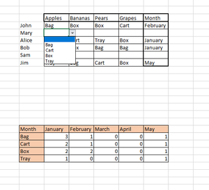 Hello, I have a large range of cells that each have a list associated with them, such as Bag, Box, Cart, Tray. Another column in the range of cells has months associated with the rows. My goal t...