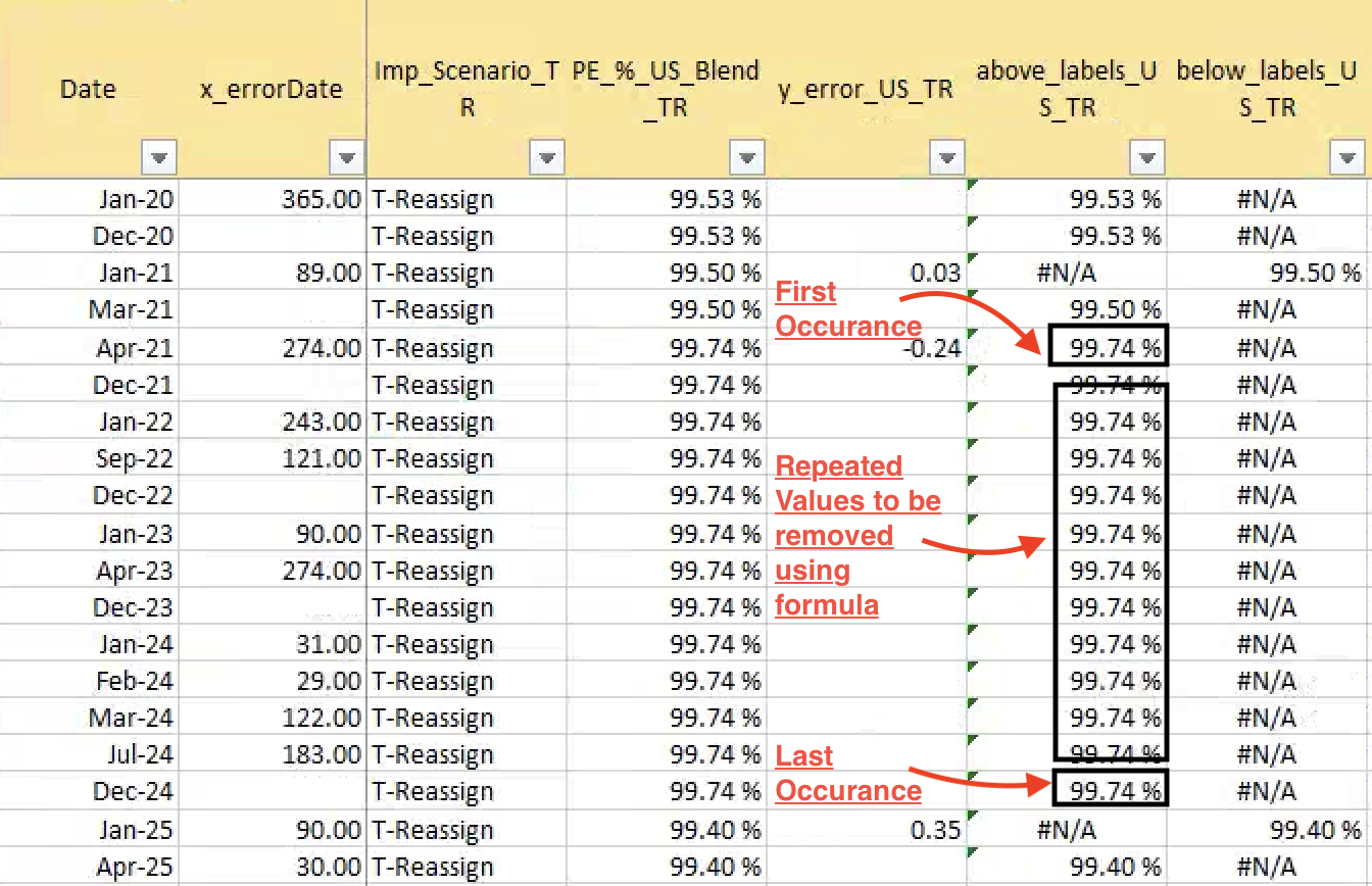 The range of column data contains repeated values for which I want to find a formula to keep the first and last occurrences of the repeated values and remove the ones in between.