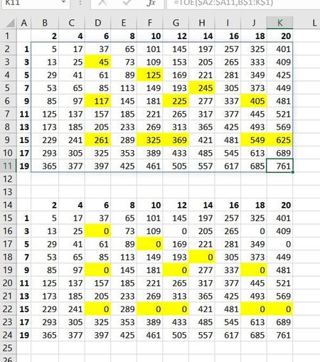 TOE= LAMBDA( O, E, LET( fn, LAMBDA(O,E,IF(GCD(E,O)=1,E^2+O^2,0)), MAKEARRAY( ROWS(O), COLUMNS(E), LAMBDA(r,c, fn(INDEX(O,r), INDEX(E, c) )) ) ) )