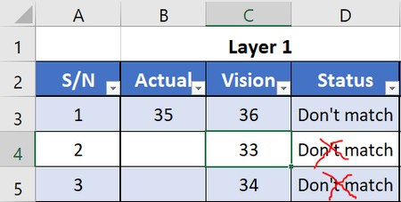 Hi All, I would like to know how to leave the cell D4 empty (Don't want to show "Don't match") when either cell B4 or C4 is not filled? Same goes the row 5 as well.