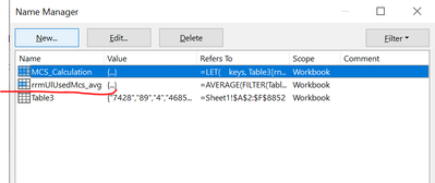 =AVERAGE(FILTER(Table3[rrmUlUsedMcs], Table3[rnti]=Sheet1!J6))Also, since the defined formula is using a relative reference, J6 is relative to the active cell at the time of defining the name. If you always want it to reference the values in column J, use a mixed cell reference with absolute columns and relative rows (=Sheet1!$J6).