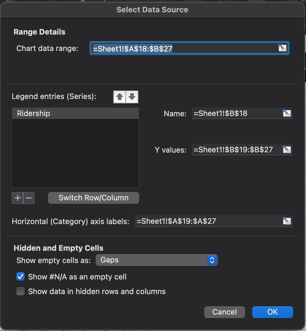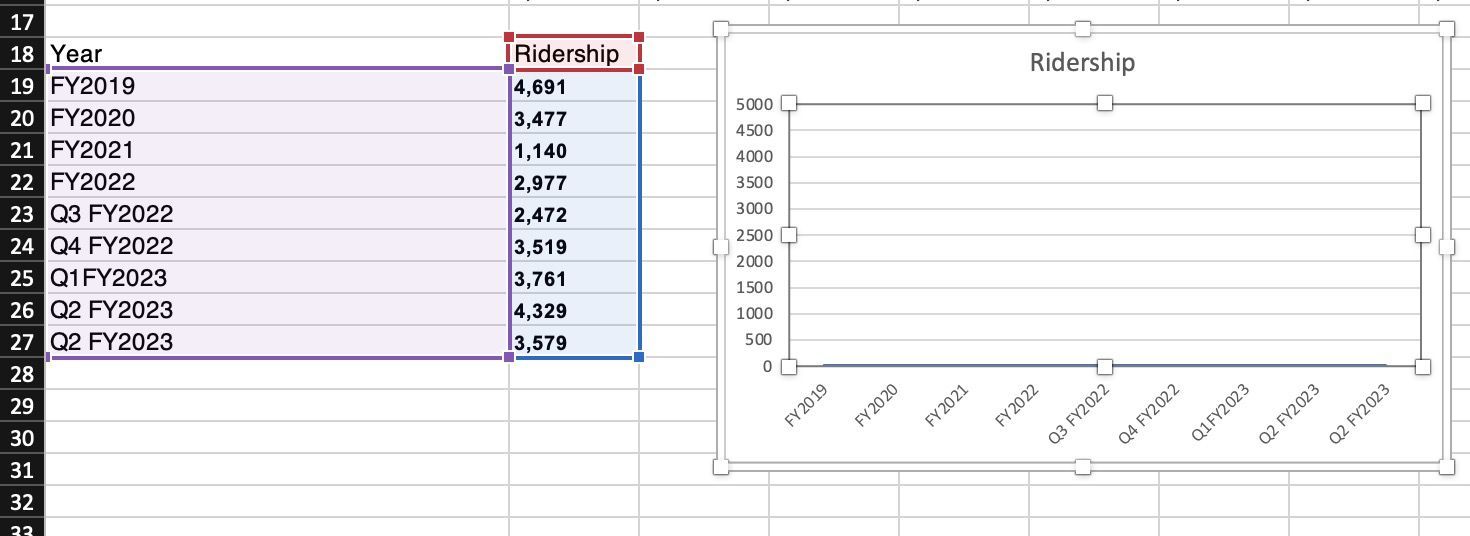 - JBravo1217Copper ContributorHello thank for your response. I tried that and changed the Ridership column to Number. I also removed the commas but still no line graph is showing up.