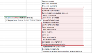 I am trying create a formula which will produce a "true" or "false" or in my case "native" or "exotic" plant species, the problem is that excel will not recognise my text at the source when I select ...