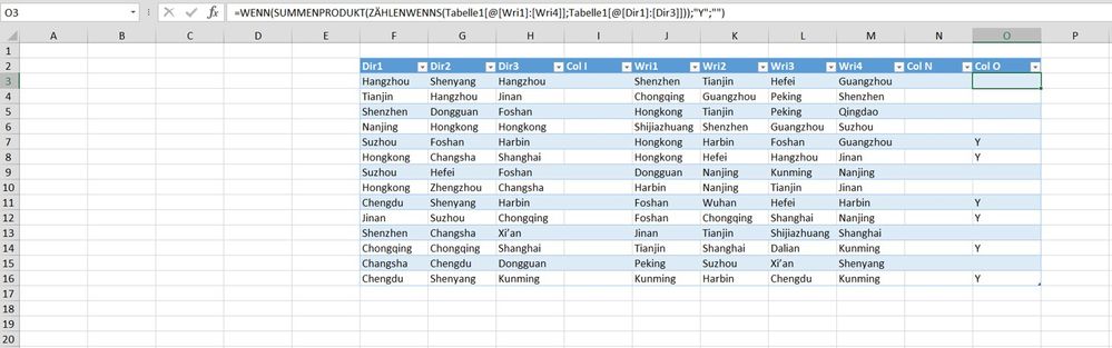 =IF(SUMPRODUCT(COUNTIFS(Tabelle1[@[Wri1]:[Wri4]],Tabelle1[@[Dir1]:[Dir3]])),"Y","")You can apply this formula. It spills the result down the column. The table name in my example is "Tabelle1".