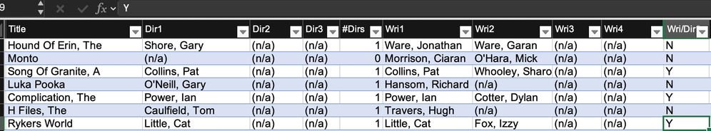 Hello. I have a Table of film credits, including the names of directors and writers. Some films have multiple directors (up to 3 individuals), whose names are in columns F, G and H. The writers' name...