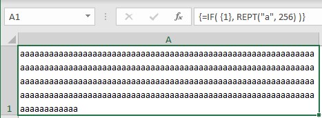 =IF( {1}, REPT("a", 256) )works for me if I confirm the formula with Ctrl+Shift+Enter (using Excel 2021, which has dynamic arrays).