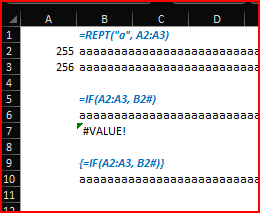 =IF( {1}, REPT("a", 256) ) returns #VALUE!