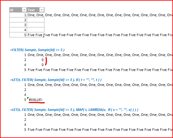 =LET( t, FILTER(range, criteria), MAP( t, LAMBDA(v, IF( v= "", "", v) ) ) )or back to simplest case