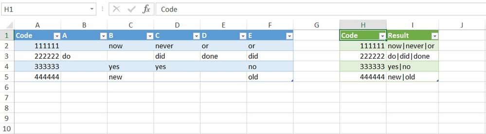 let Source = Excel.CurrentWorkbook(){[Name="Tabelle1"]}[Content], AddResult = Table.AddColumn( Source, "Result", each Text.Combine( List.Distinct( List.Skip( Record.FieldValues(_) ) ), ", " ), type text ), SelectColumns = Table.SelectColumns(AddResult,{"Code", "Result"}) in SelectColumnsTo play with Office Script