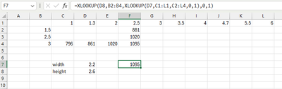 I would need the formular to not only work out where the number sits (I.e. width is less than 2.5 but more than 2.0 but also that the height is less than 3.0 and more than 2.5) and then LOOKUP to give me a result of $1,095.00