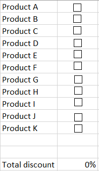 Hello, We are working on a pretty odd way to give discount to our client based on wich products they purchase combined to each other. I would like to make a verry simple excel using checkboxes ...