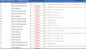 One possible way to have a date populate in “Process: Check due date” column based on certain criteria is to use a combination of IF and DATE functions. The IF function can check if the State ISO matches a certain value, and the DATE function can add a number of days to the Termination date based on the Quickpay rule.