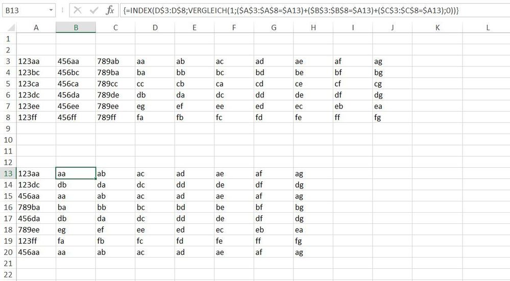 =INDEX(D$3:D$8,MATCH(1,($A$3:$A$8=$A13)+($B$3:$B$8=$A13)+($C$3:$C$8=$A13),0))You can try this formula for the data layout of the example. Enter the formula with ctrl+shift+enter if you don't work with Office365 or 2021.