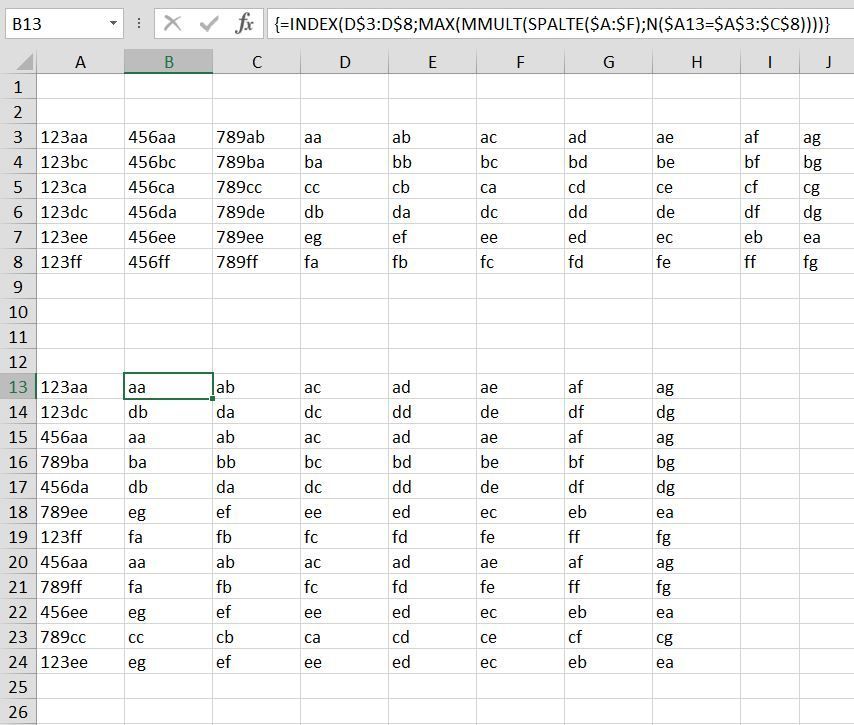 =INDEX(D$3:D$8,MAX(MMULT(COLUMN($A:$F),N($A13=$A$3:$C$8))))You can try this formula for the data layout of the example. Enter the formula with ctrl+shift+enter if you don't work with Office365 or 2021. The ranges can be adapted as required.