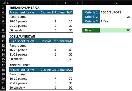 I am trying to create sort of a calculator where the user will choose 3 variables form dropdowns to return a price. The chart below is the information that they would provide and the result they should receive. For example, they would choose Trina, 22 panels, and cash and the result would be $3.10. Can someone assist with how to write this formula?