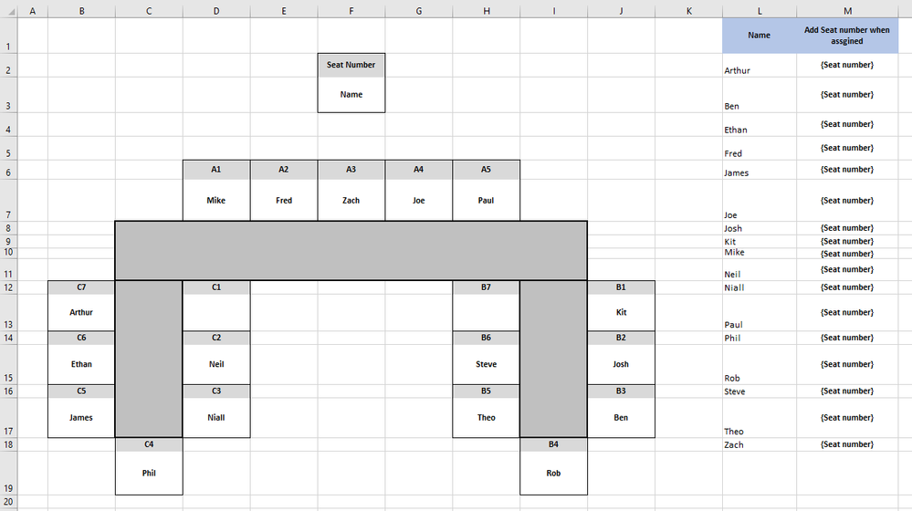 In Excel, I've a table plan where I've assigned names to numbered seats.