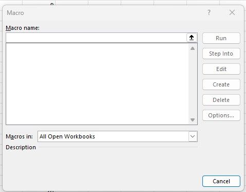 chrishall166 Buttons in that dialog will be enabled if you type a macro name in the "Macro name" box (or choose one from the list if there are any). If the macro is available in any of the workbooks (or in the workbook you select in the drop-down), then the Edit and Run buttons are enabled. The Create button gets enabled as soon as you enter a valid macro name.