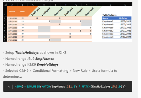 Sub HighlightHolidays() Dim hol As Variant Dim emp As String Dim dtm As Date Dim i As Long Dim r As Long Dim c As Long Application.ScreenUpdating = False hol = Range("TableHolidays").Value For i = 1 To UBound(hol) dtm = hol(i, 2) r = Range("A:A").Find(What:=dtm, LookAt:=xlWhole).Row emp = hol(i, 1) c = Range("1:1").Find(What:=emp, LookAt:=xlWhole).Column Cells(r, c).Interior.Color = RGB(217, 217, 217) Next i Application.ScreenUpdating = True End Sub- Celia9Oct 18, 2022Brass Contributor