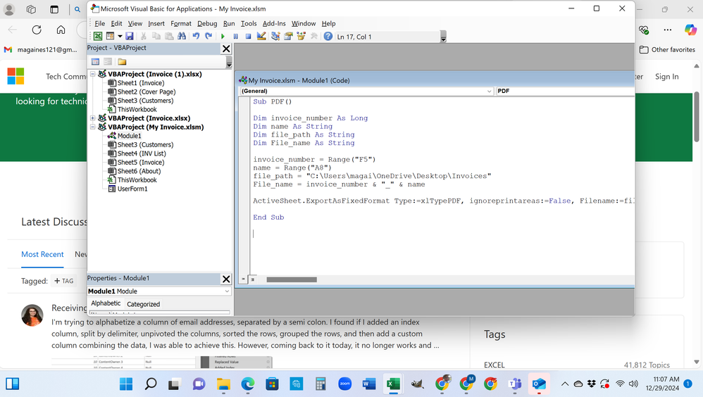 I followed along with creating an invoice that has a print to PDF button. When I run the macro, it flickers as if it is working, but no PDF is in the file. Here are screenshots that may help see the problem.
