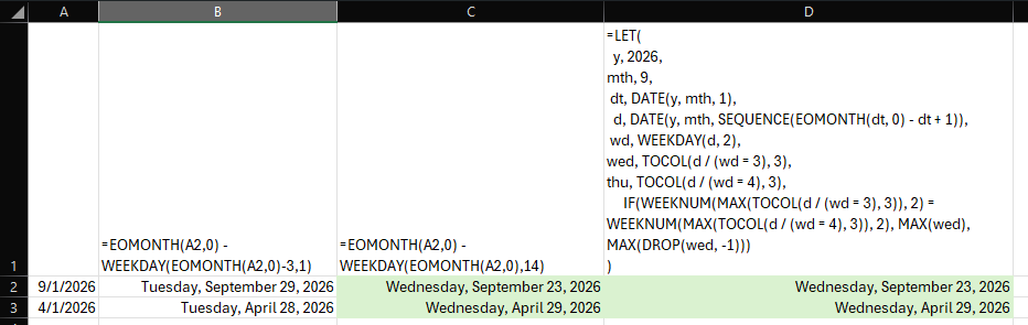 =LET( y, 2026, mth, 9, dt, DATE(y, mth, 1), d, DATE(y, mth, SEQUENCE(EOMONTH(dt, 0) - dt + 1)), wd, WEEKDAY(d, 2), wed, TOCOL(d / (wd = 3), 3), thu, TOCOL(d / (wd = 4), 3), IF(WEEKNUM(MAX(TOCOL(d / (wd = 3), 3)), 2) = WEEKNUM(MAX(TOCOL(d / (wd = 4), 3)), 2), MAX(wed), MAX(DROP(wed, -1))) )Change the year and month in formula as per you need.