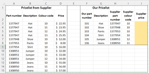 Hello, I have a pricing spreadsheet from our supplier, which gives their part numbers in column A. But many parts are available in different colours, so they have used a "Colour Code" entry in colum...