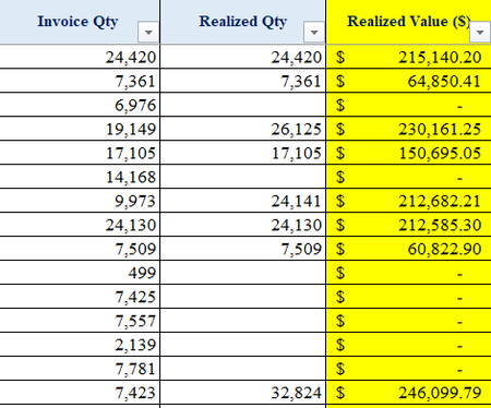 Please have a look on the Realized Qty column. I manually calculated realized qty column which is very time consuming because there're more than 1000 rows. When the realized value is blank, I have to...