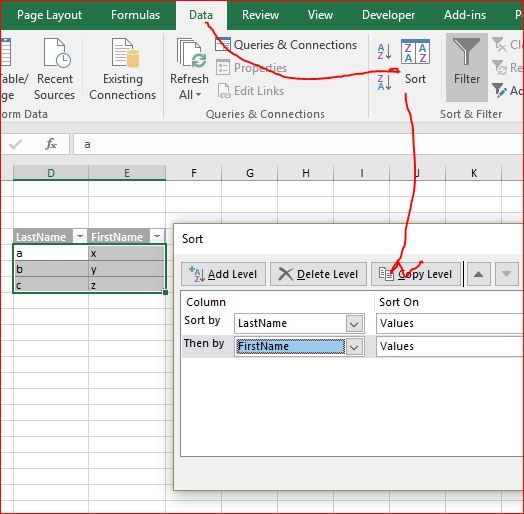 You want to sort a table by last name and then by first name. How would you accomplish this?