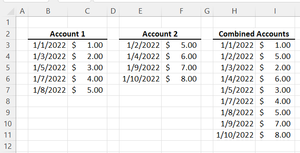 I am looking for a formula or Macro that can merge/combine two columns of data into one based on date order. The data in columns B, C, E, and F would be manually entered, and the data in columns H an...