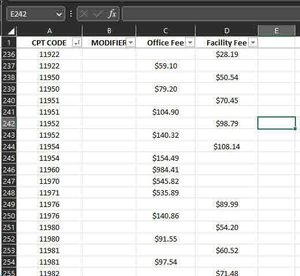 In the spreadsheet below, I'm trying to remove duplicate "CPT Code" data, merging "Office Fee" and "Facility Fee" into one line for each CPT Code. Note that there are some codes, like 11960 that don...