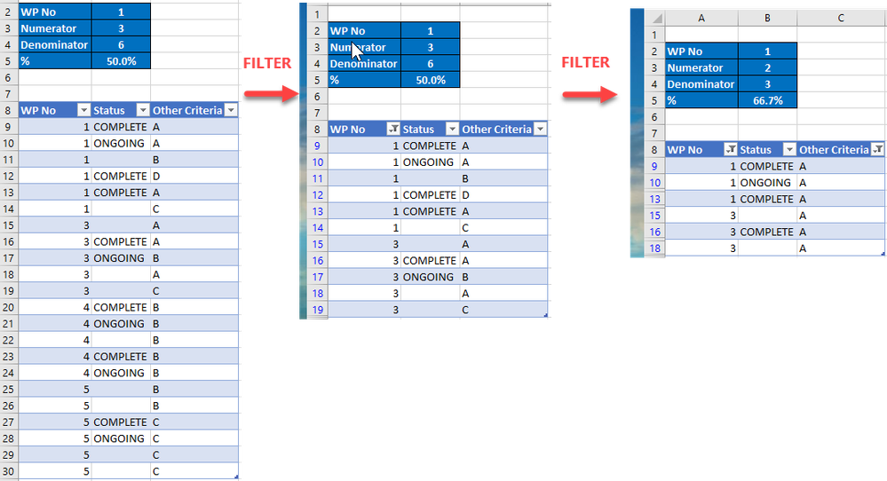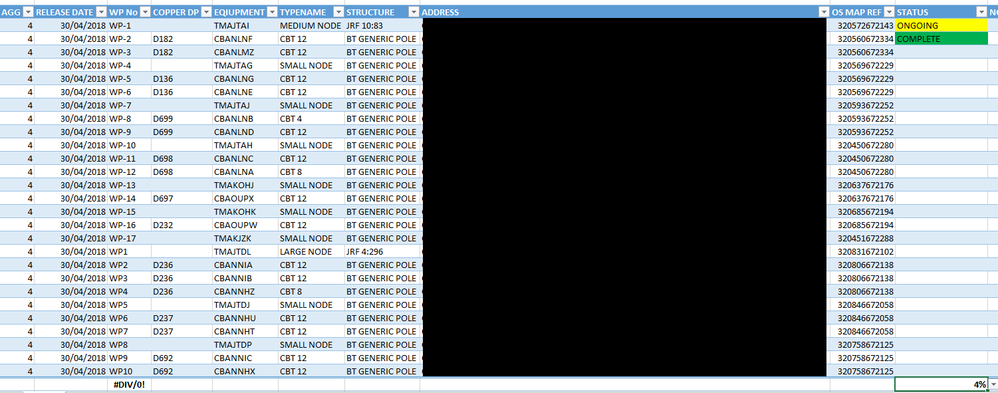 I have a list of engineering job packs- 1 Job pack can have several work points in this job pack. I have a status column and I want to count the percentage of "complete" cells In relation to the amount of work points filtered...